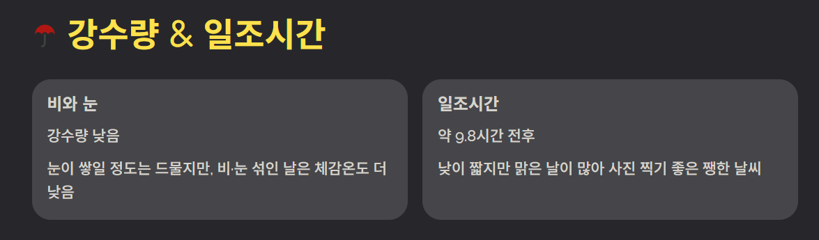 12월은 비와 눈이 자주 오지 않는 편입니다. 평균적으로 강수량은 낮으며, 눈이 오더라도 쌓일 정도의 눈은 드뭅니다. 하지만 비·눈이 섞인 날은 체감 온도를 더욱 낮추기도 합니다.