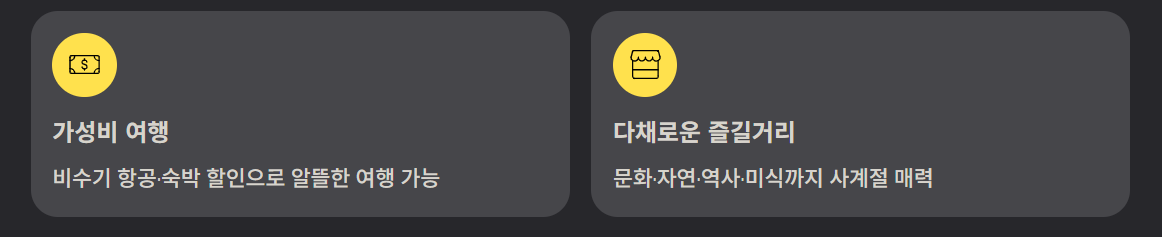 ✔ 지금 계획하면 항공/숙박 혜택도 챙길 수 있어 가성비 여행지로 추천합니다!