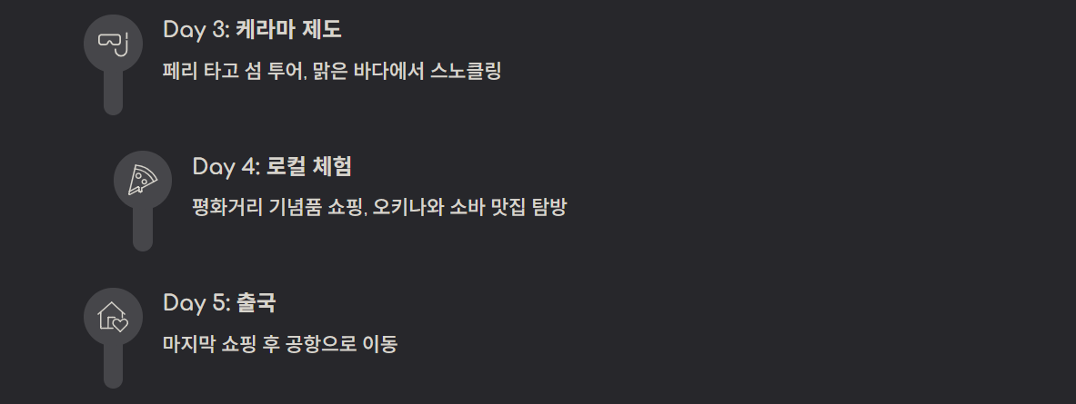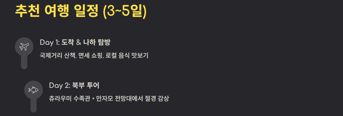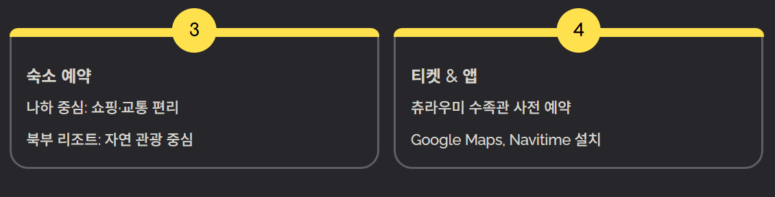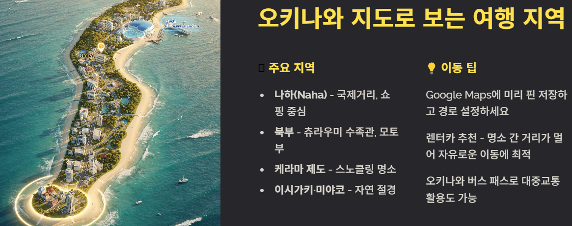 여행 전에 Google Maps에 방문지 핀 저장 + 도보/차량 경로 설정하면 이동 시간·교통비 최소화에 도움이 됩니다. 또한 각 명소 간 거리가 멀어 렌터카 또는 오키나와 버스 패스 구매가 추천됩니다.