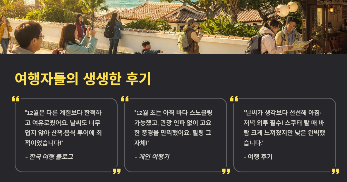 “오키나와 12월은 다른 계절보다 한적하고 여유로웠습니다. 날씨도 너무 덥지 않아 산책·음식 투어에 최적이었어요.” (한국 여행 블로그)