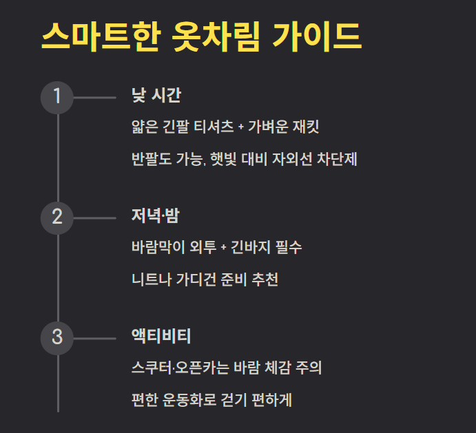 ✅ 낮: 얇은 긴팔/반팔 + 가벼운 재킷