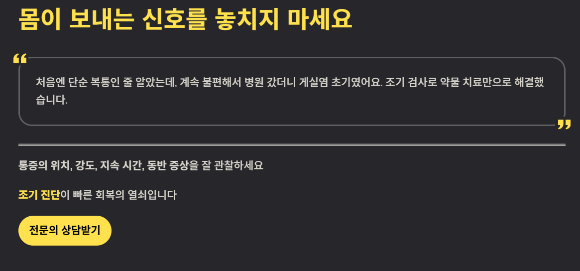 “처음에는 단순한 복통인 줄 알았는데, 계속 왼쪽 아랫배가 불편해서 병원에 갔더니 게실염 초기라고 하더라고요. 미리 검사받아서 약물 치료로 해결할 수 있었습니다.”