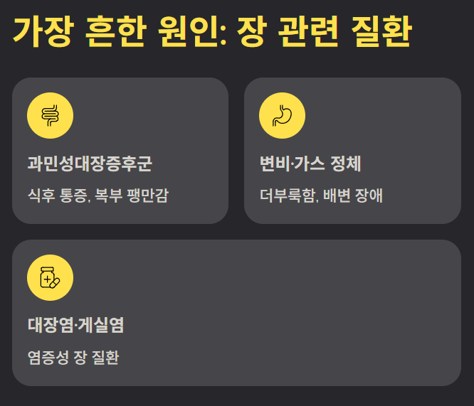 특히 식후 통증, 복부 팽만감, 설사 또는 변비가 동반된다면 장 문제를 의심해볼 수 있습니다.