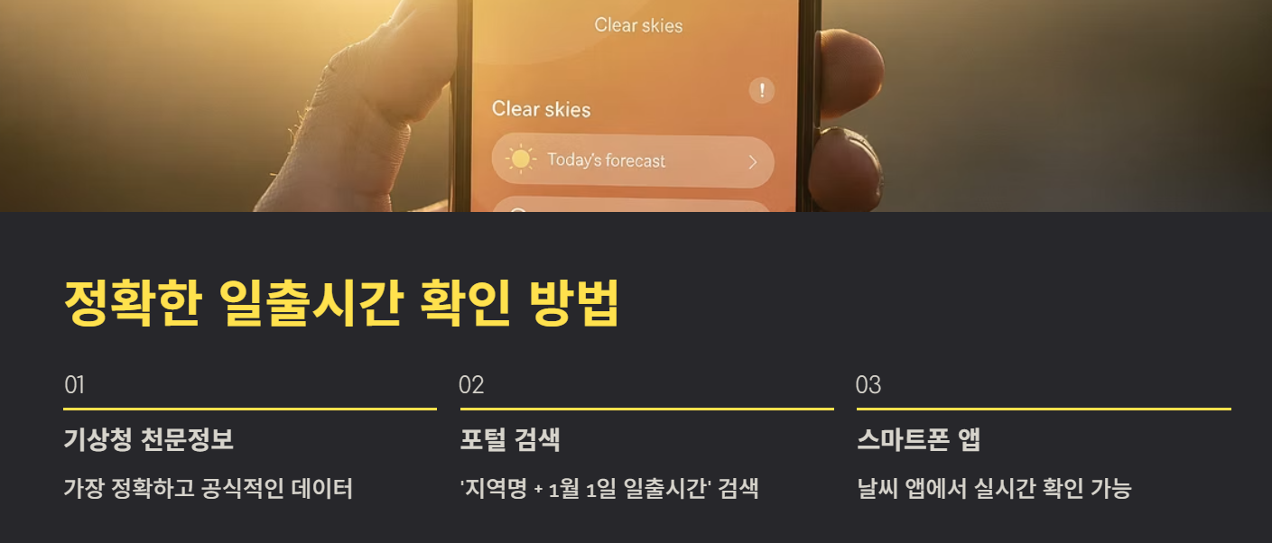가장 정확한 방법은 기상청 천문정보 또는 포털 사이트 검색입니다. ‘지역명 + 1월 1일 일출시간’으로 검색하면 최신 정보를 바로 확인할 수 있습니다. 스마트폰 날씨 앱도 유용합니다.