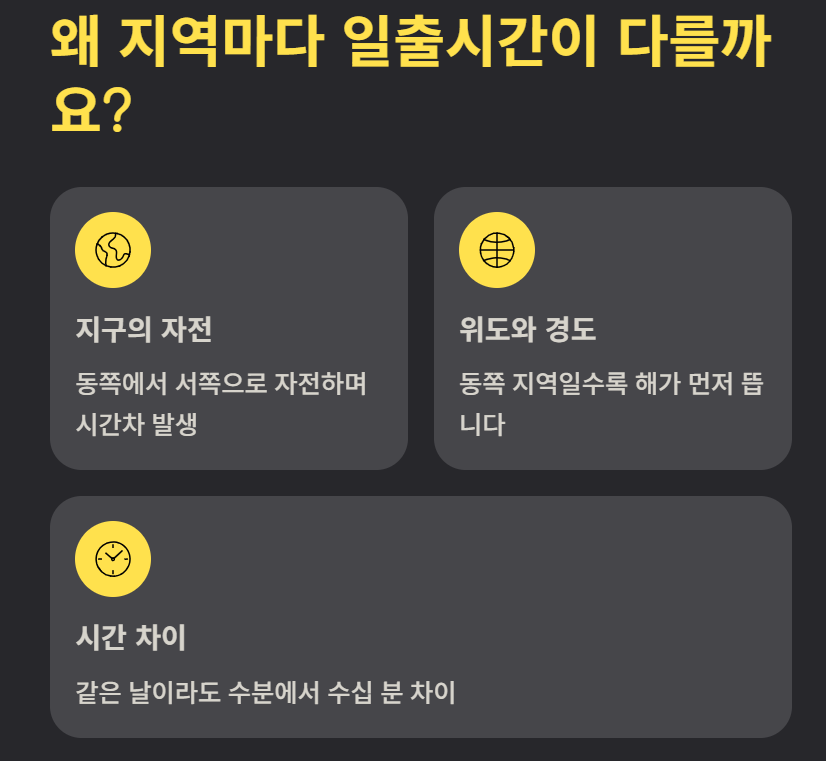일출시간은 지구의 자전과 위도, 경도 차이에 따라 달라집니다. 동쪽에 위치할수록 해가 빨리 뜨고, 서쪽으로 갈수록 늦게 뜹니다. 따라서 같은 1월 1일이라도 지역별로 일출시간에는 수 분에서 수십 분의 차이가 발생합니다.