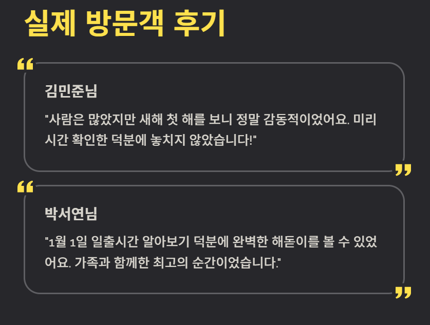 서울 근교 해돋이 명소를 찾았던 방문객들은 “사람은 많았지만 새해 첫 해를 보니 감동적이었다”, “1월 1일 일출시간 알아보기 덕분에 놓치지 않고 감상했다”는 후기를 남기곤 합니다. 미리 시간을 확인한 것이 만족도를 높였다는 의견이 많습니다.