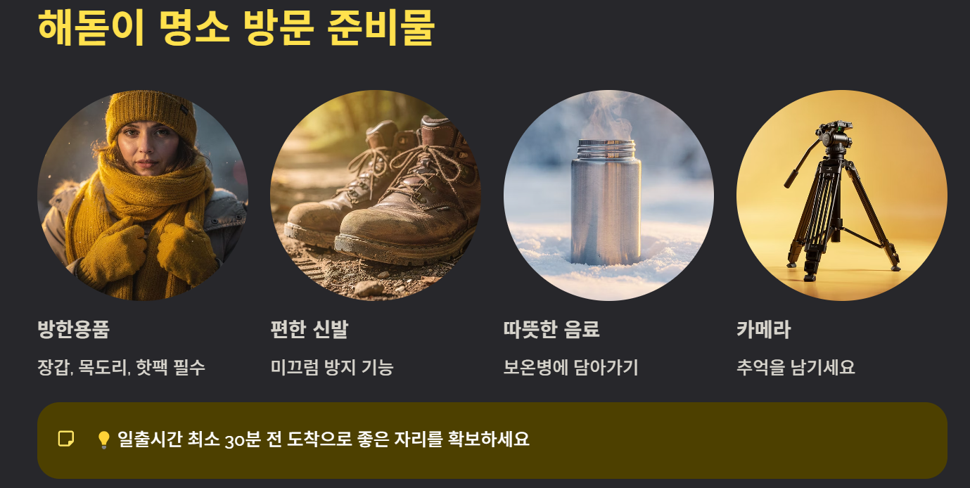 새벽 기온이 매우 낮기 때문에 방한용품은 필수입니다. 장갑, 목도리, 핫팩을 준비하고, 미끄럼 방지를 위해 편한 신발을 착용하는 것이 좋습니다. 일출시간 최소 30분 전에는 도착해야 좋은 자리를 확보할 수 있습니다.