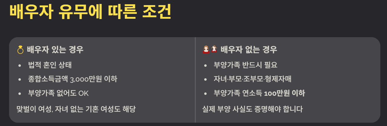 즉, 결혼한 여성 또는 미혼이지만 가족을 부양하는 여성이라면 공제 대상이 될 수 있습니다.