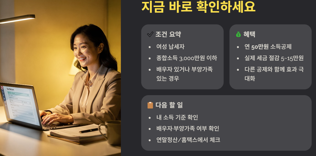 이 제도는 여성 가장이나 소득이 있는 여성 근로자를 지원하기 위해 만들어졌으며, 특히 가족을 부양하는 여성에게 유리한 절세 혜택입니다.
