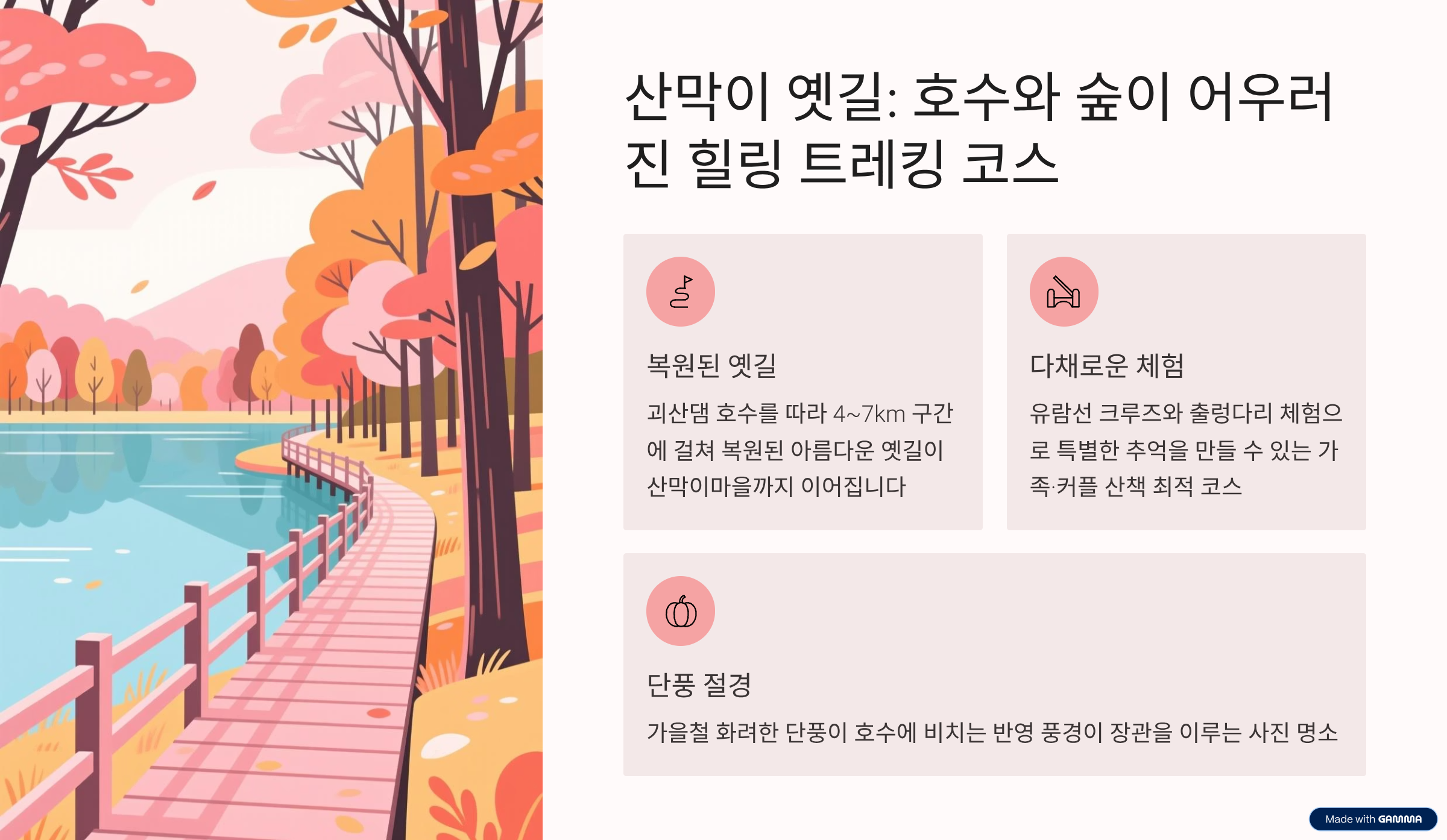 1. 괴산호 수변길 트레킹 괴산호를 따라 조성된 10km의 옛길을 복원한 곳으로, 호수와 단풍이 조화를 이룹니다. |