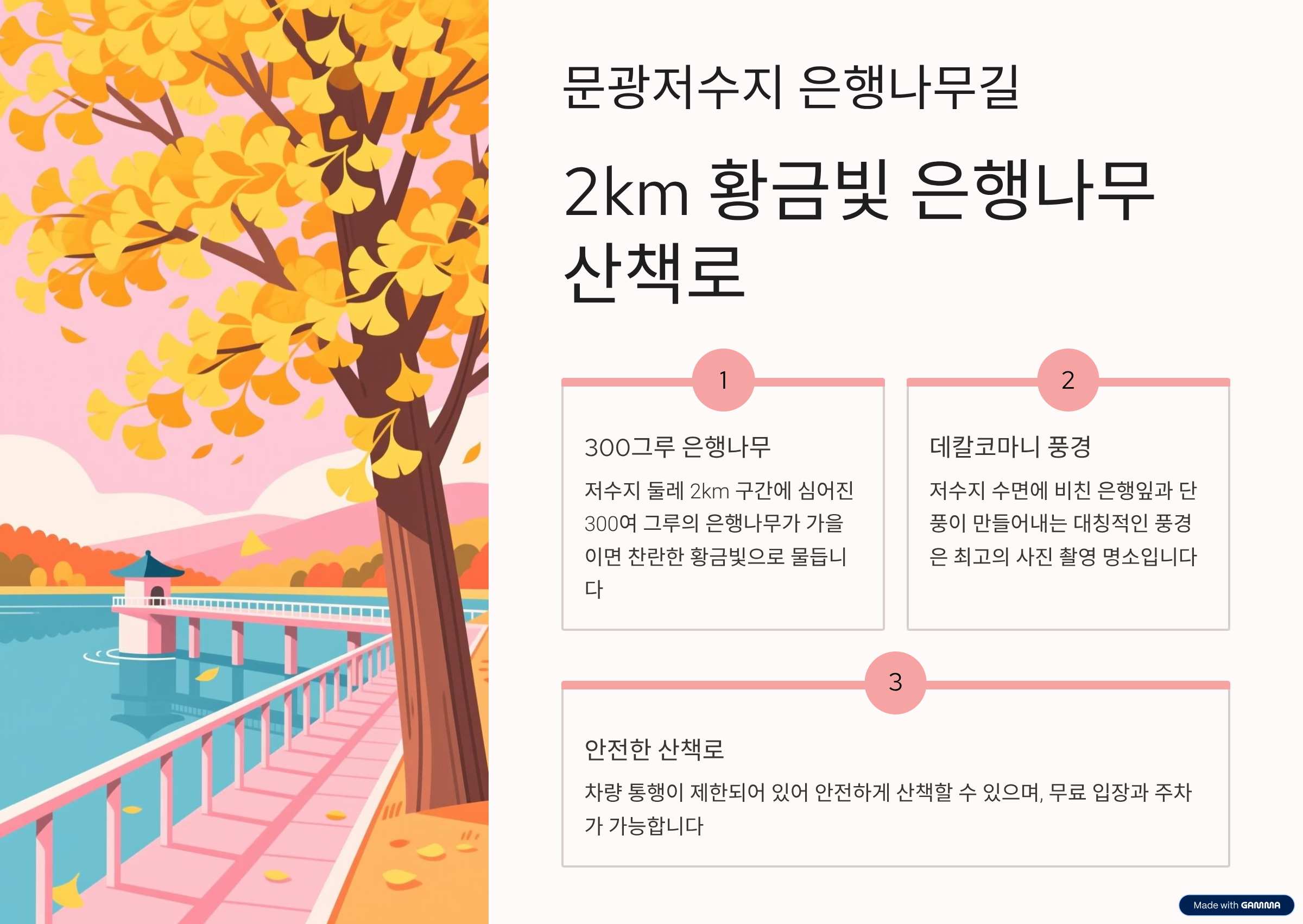 1️⃣ 문광저수지 은행나무길: 몽환적인 황금빛 물안개 반영샷 성지