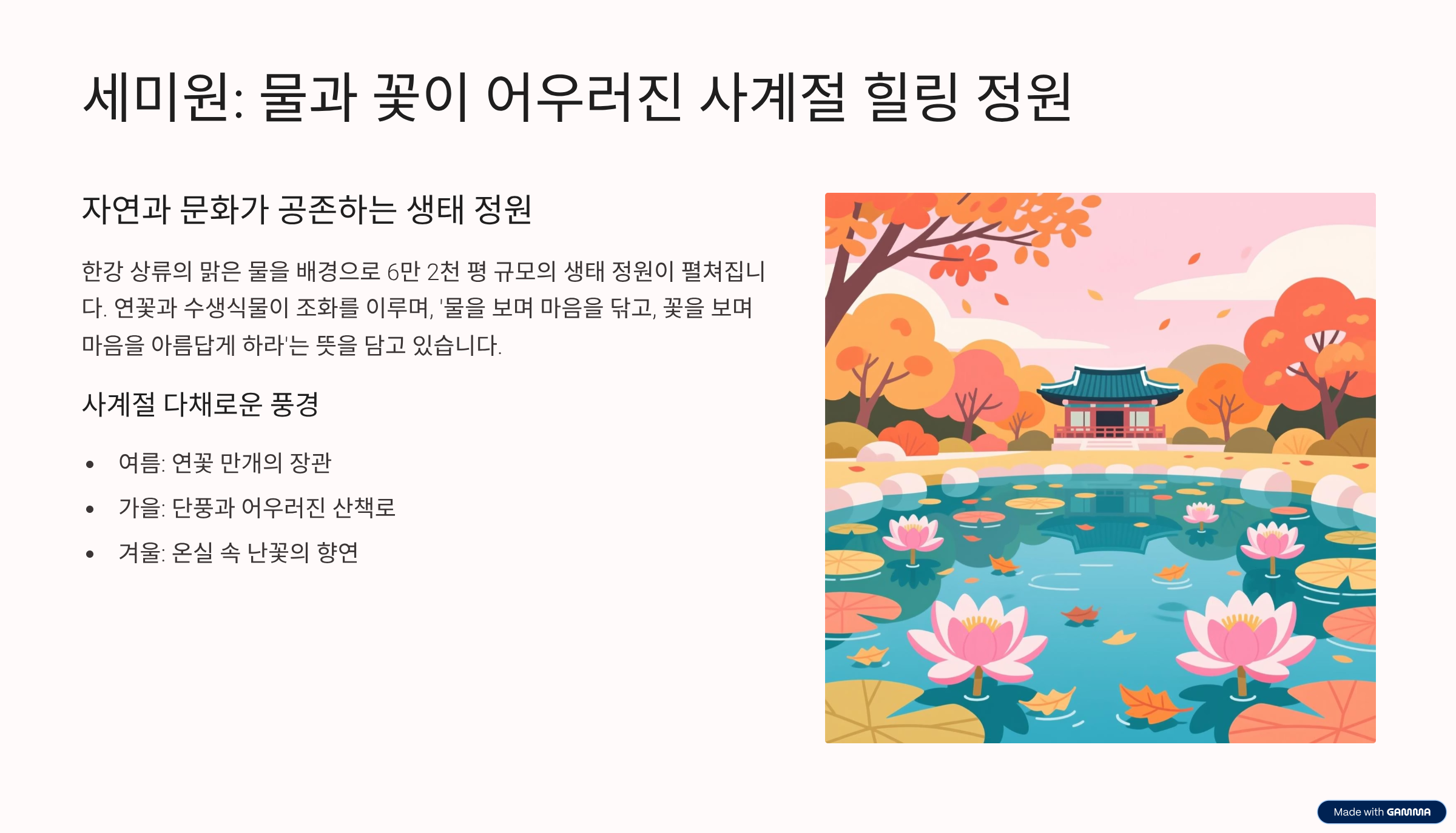 * 세미원 (연꽃 정원): 여름의 연꽃이 유명하지만, 가을에는 수목과 남한강 리버뷰가 조화롭게 어우러져 또 다른 감성적인 가을 낭만을 느껴보세요