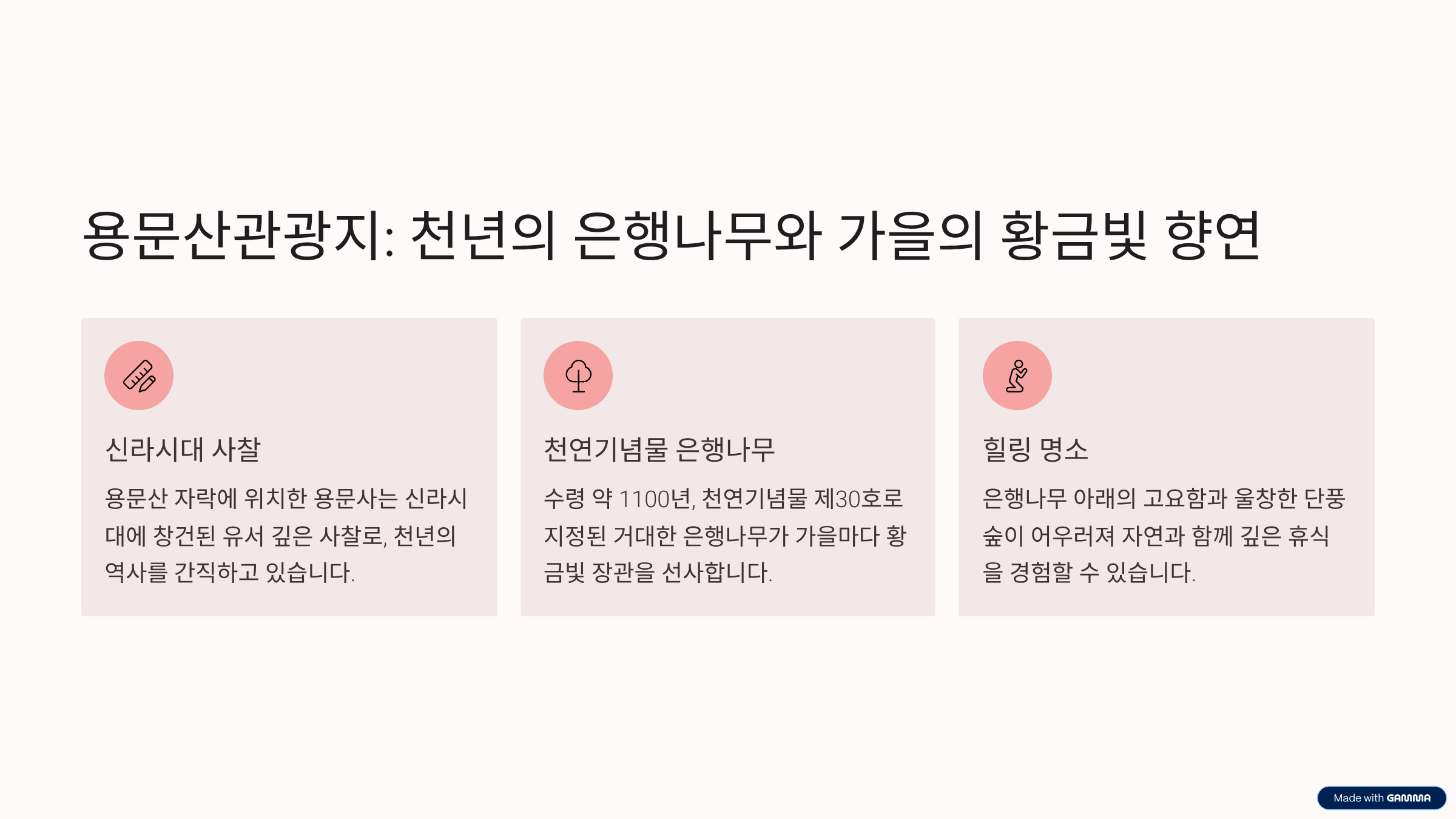 | 팁 | 은행나무 절정 시기(10월 말~11월 초)는 인파가 많으니 방문 시간 조정 권장 |