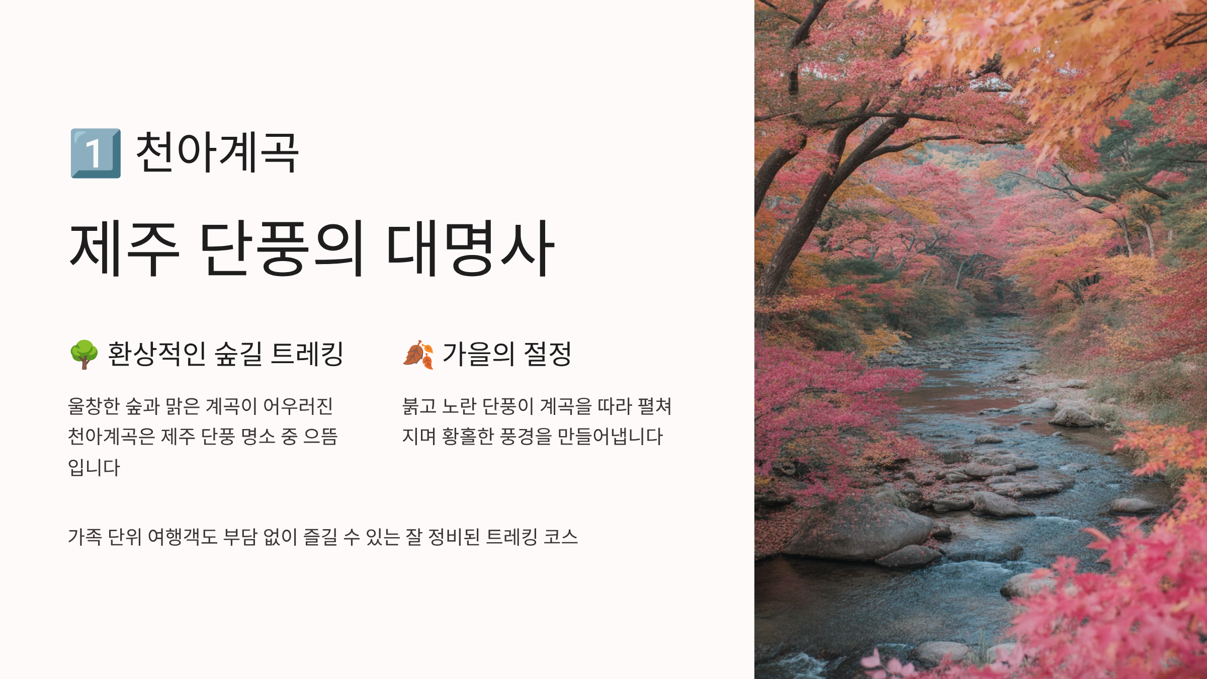 1️⃣ 천아계곡: 제주 단풍의 대명사, 환상적인 숲길 트레킹 🚶♀️