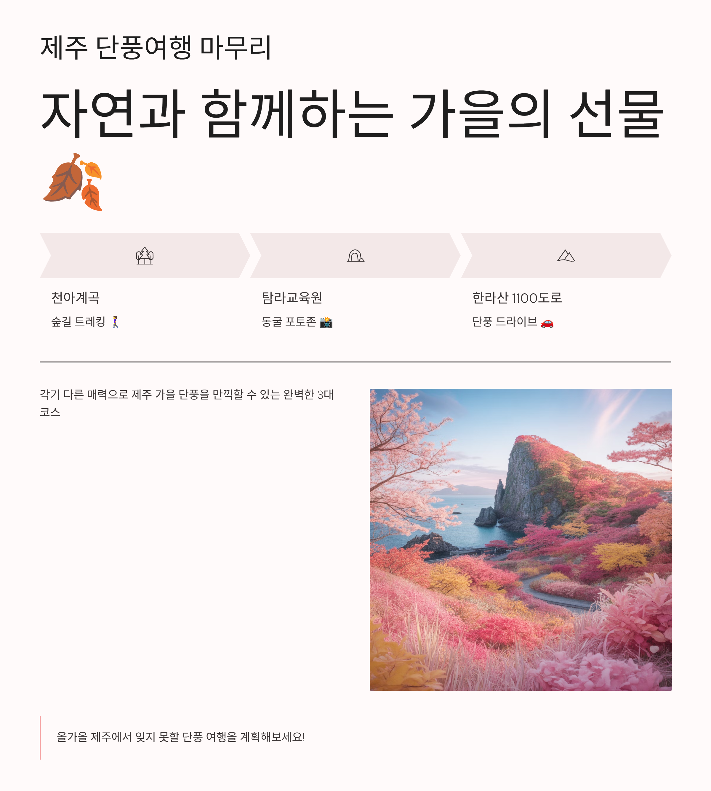 제주의 가을은 짧고 아름답습니다. 소개해 드린 세 곳의 단풍 명소에서 잊지 못할 가을 추억을 만들어보세요!