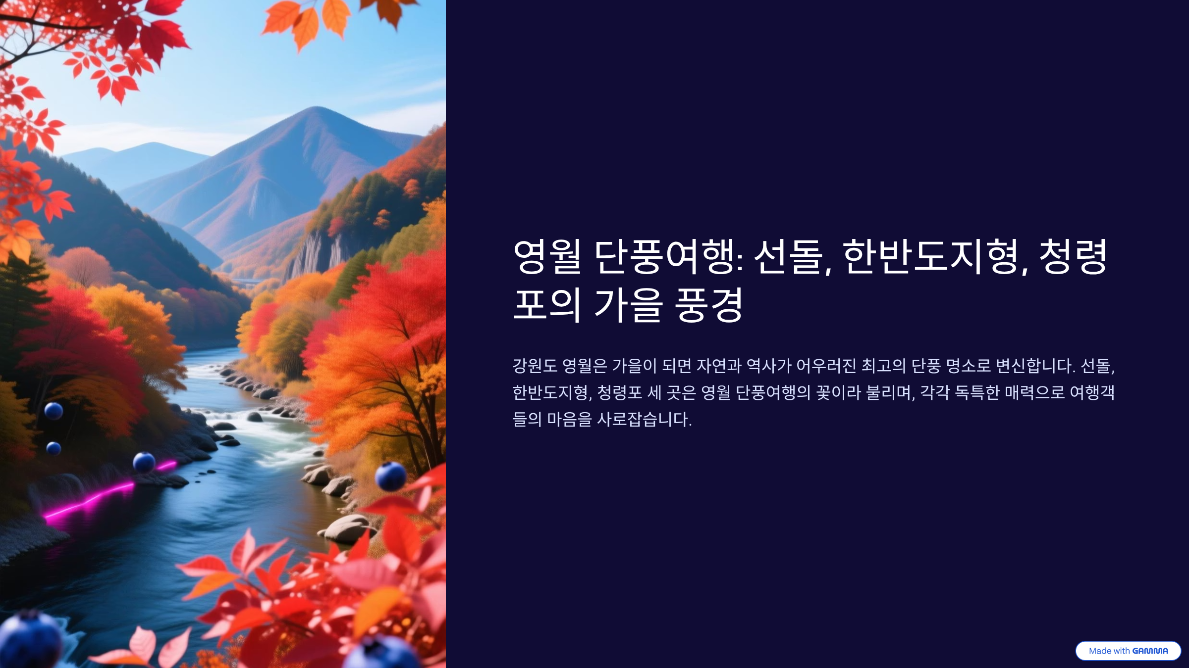 * 단풍 시기: 영월은 보통 10월 중순~하순경에 단풍이 절정에 이릅니다 (매년 기후에 따라 변동될 수 있으니 여행 전 확인 필수).