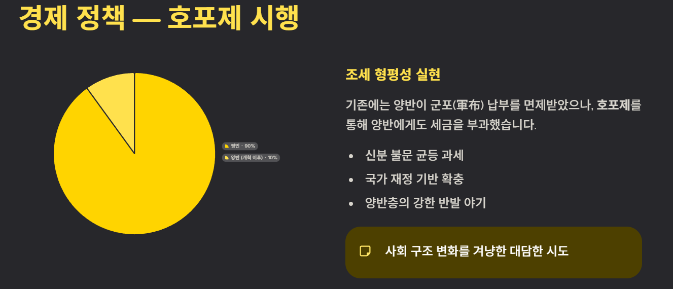 호포제를 시행하여 양반에게도 세금을 부과하는 등 조세 형평성을 높이려 했습니다. 이는 사회 구조 변화의 시도였습니다.