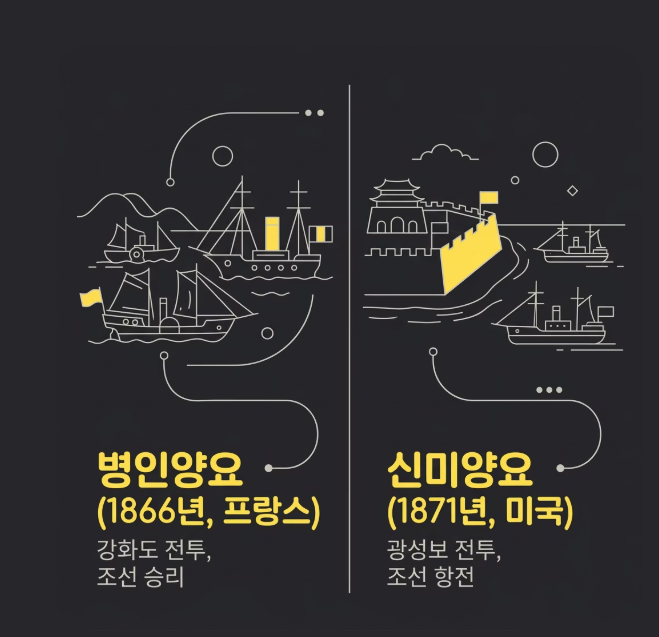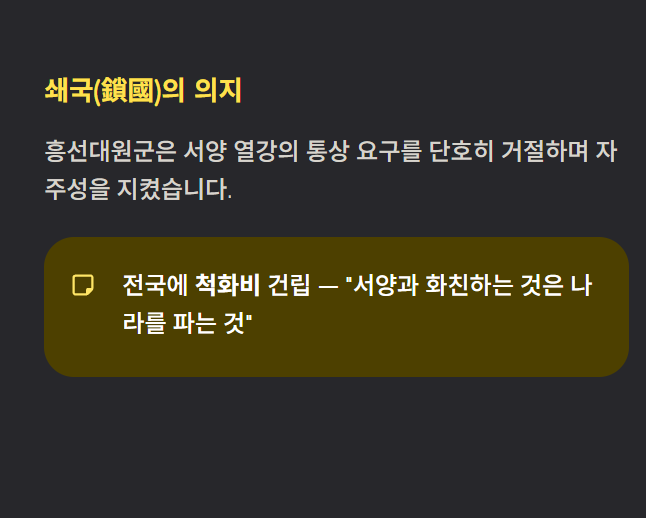 외세의 침략을 막기 위해 쇄국 정책을 펼쳤습니다. 특히 병인양요와 신미양요에 강경 대응하며 자주성을 지키려 했습니다.