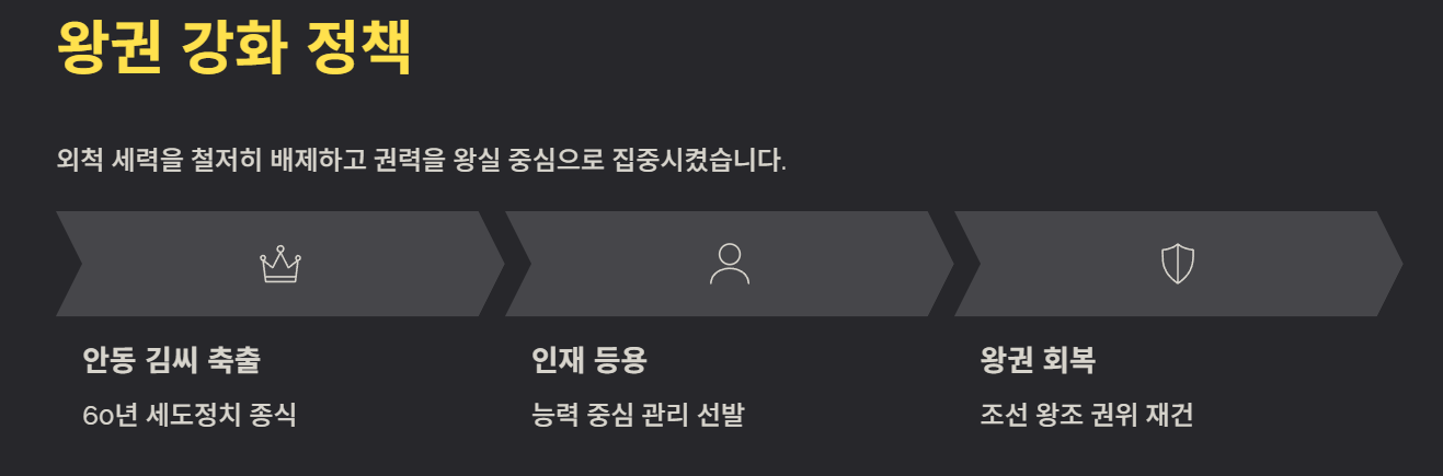 그는 왕권 회복을 위해 외척 세력을 철저히 배제하고 권력을 집중시켰습니다. 특히 안동 김씨 세력 축출은 대표적인 사례입니다.