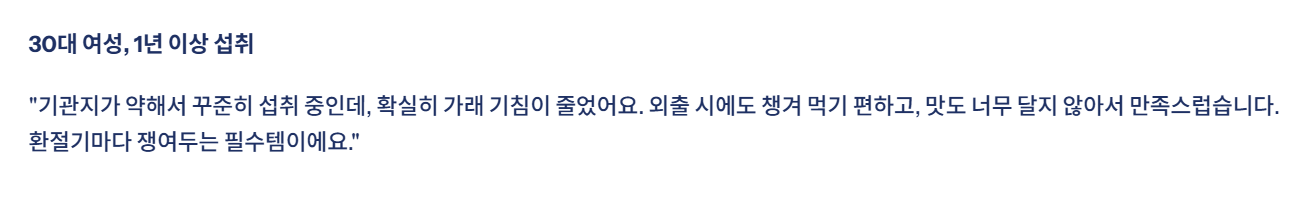 📌 솔직 후기"기관지가 약해서 꾸준히 섭취 중인데, 확실히 가래 기침이 줄었어요. 이지컷 스틱이라 외출 시에도 챙겨 먹기 편하고, 맛도 너무 달지 않고 도라지의 쓴맛을 배가 잘 잡아줘서 만족스럽습니다. 환절기마다 쟁여두는 필수템이에요." (30대 여성, 1년 이상 섭취)