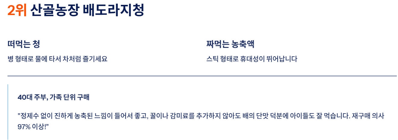 2. 산골농장 '떠먹는/짜먹는 배도라지청' (높은 만족도)