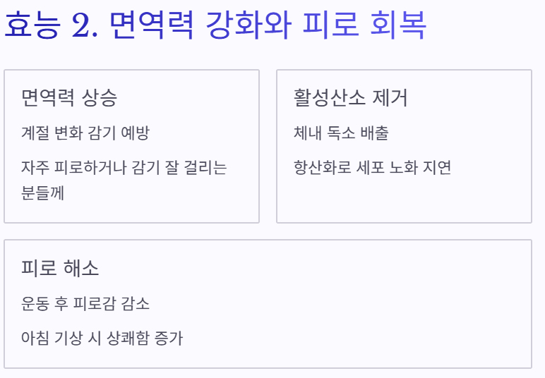 - 활성산소 제거: 항산화 작용으로 체내 독소를 배출하고 세포 노화를 늦춰줍니다.