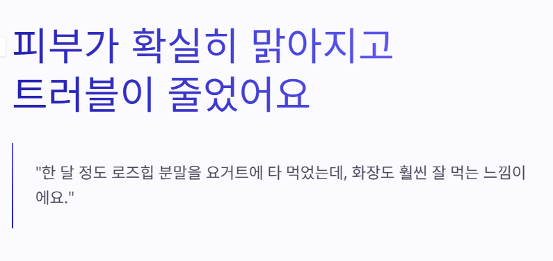 “한 달 정도 로즈힙 분말을 요거트에 타 먹었는데, 피부가 확실히 맑아지고 트러블이 줄었어요. 화장도 훨씬 잘 먹는 느낌이에요.”
