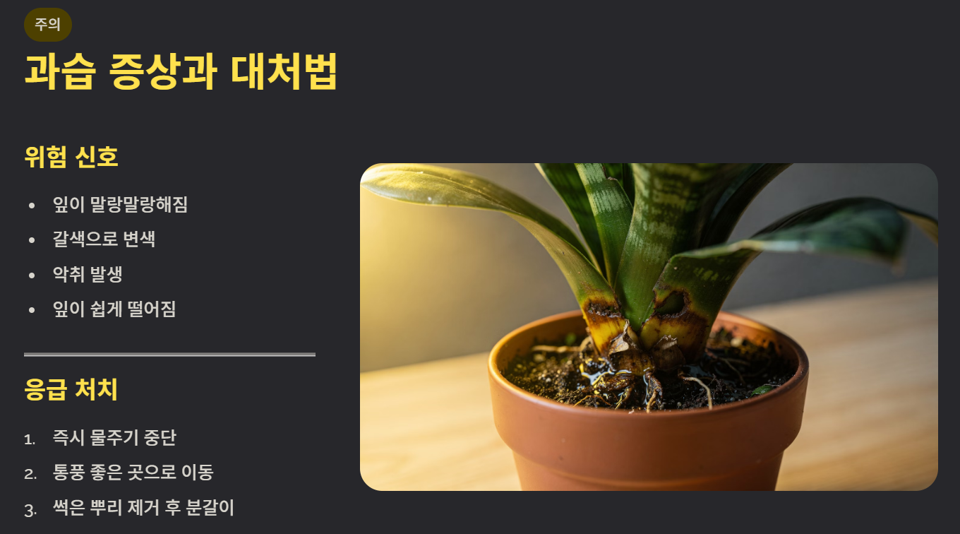 잎이 말랑해지거나 갈색으로 변하고, 심한 경우 악취가 날 수 있다. 이때는 즉시 물주기를 중단하고 통풍이 잘되는 곳으로 옮겨야 한다. 뿌리썩음이 진행됐다면 분갈이를 통해 썩은 뿌리를 제거해야 산세베리아를 살릴 수 있다.