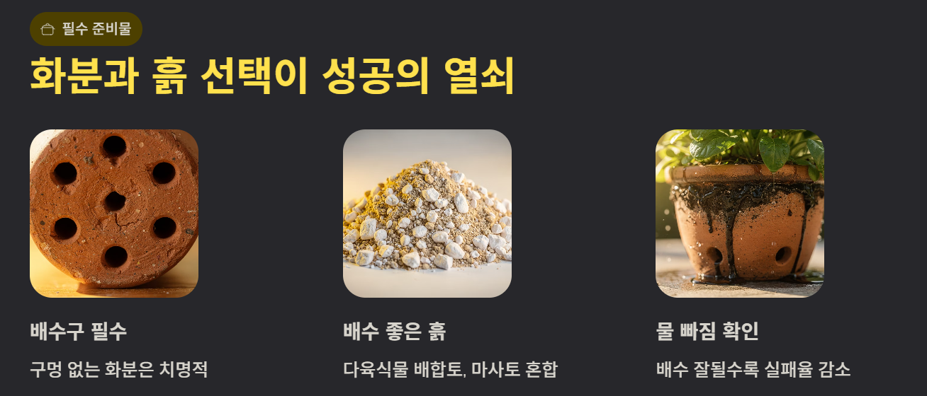배수구가 없는 화분은 산세베리아에게 치명적이다. 반드시 배수구가 있는 화분을 사용해야 하며, 흙은 다육식물용 배합토나 마사토가 섞인 흙이 좋다. 배수가 잘될수록 산세베리아 물주기 실패 확률이 크게 줄어든다.