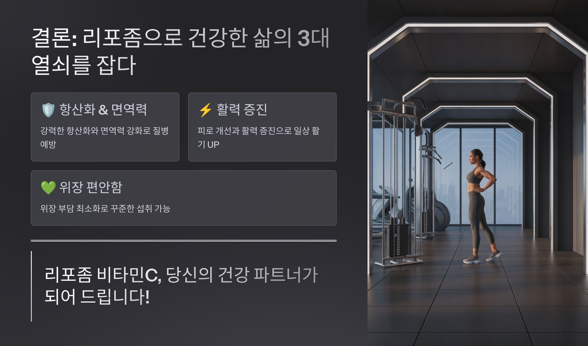 리포좀 비타민C는 낮은 흡수율과 위장 장애**라는 비타민C의 고질적인 문제를 해결한 혁신적인 제품입니다. 만성 피로에 시달리거나, 고용량 비타민C 섭취를 원하지만 속쓰림이 두려웠던 분들에게 최적의 대안이 될 수 있습니다.
