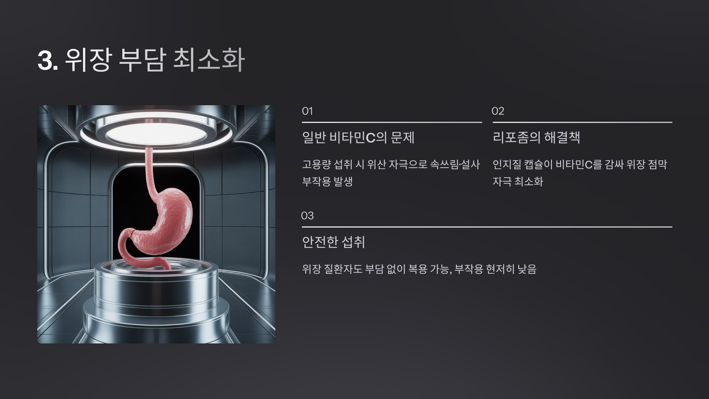 인지질 보호막:리포좀은 비타민C를 인지질로 감싸고 있어, 비타민C가 직접 위벽에 닿는 것을 최소화하여 위장 장애를 현저히 줄여줍니다.