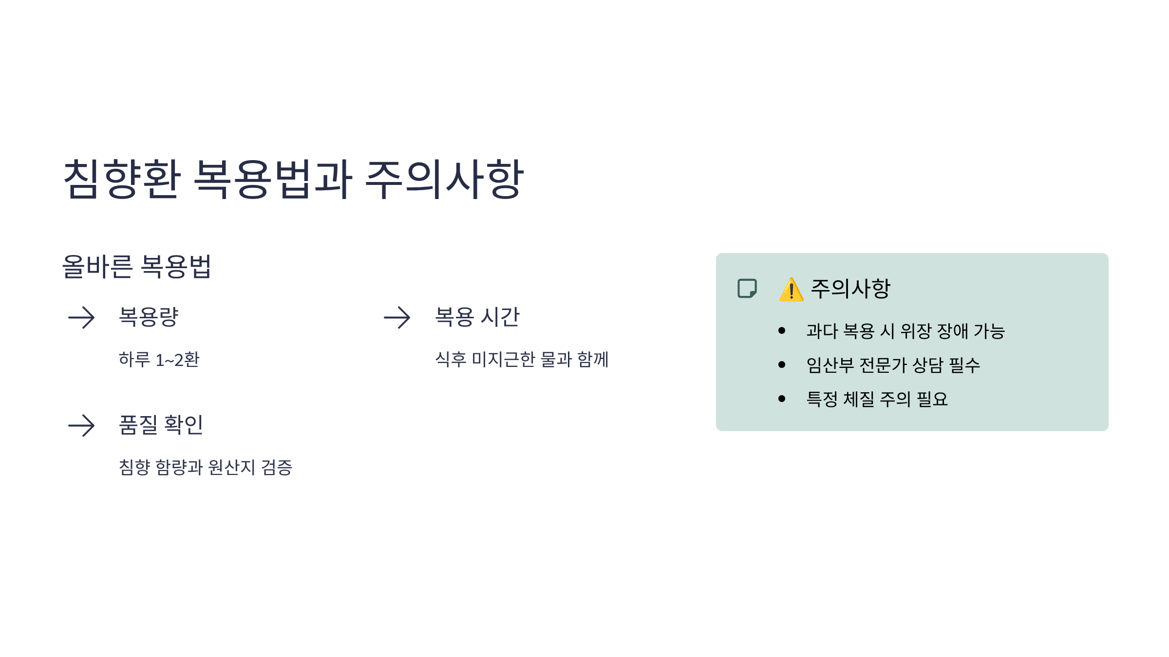 주의 사항:침향은 ’기운 소통'이 주된 목적이므로, 한의서에서는 오히려 기가 너무 허하거나 체질적으로 열이 많은 사람은 복용을 금하거나 꺼려야 한다고 언급하고 있으니 전문가와 상담 후 섭취하는 것이 좋습니다.