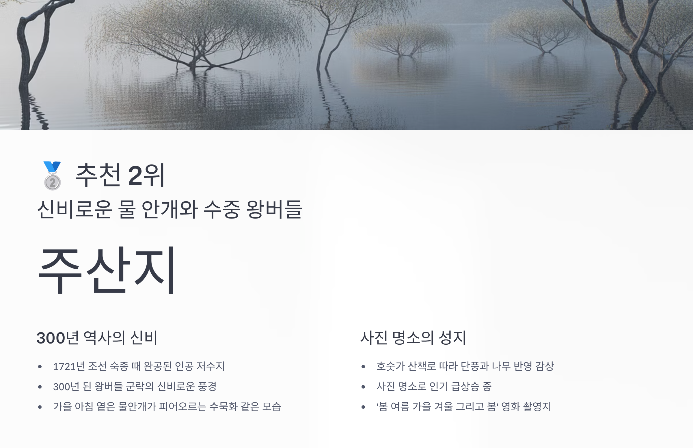🥈 추천 2. 신비로운 물 안개와 수중 왕버들, '주산지'