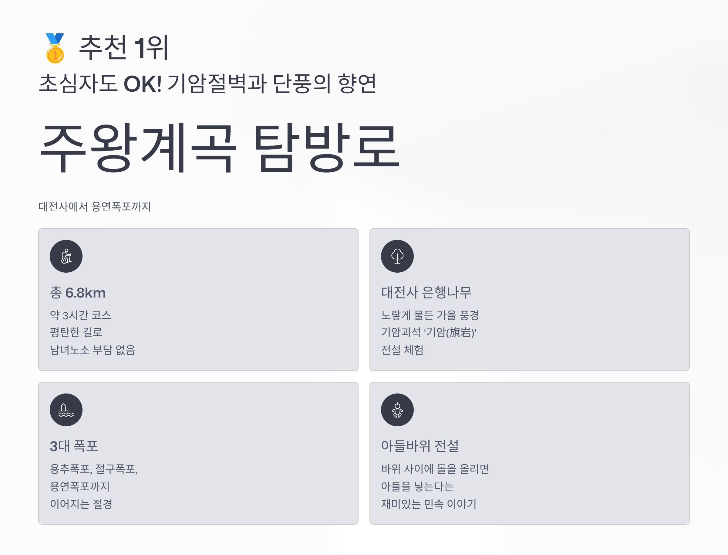 "입구부터 대전사 주변의 단풍 색감이 정말 화려했어요. 특히 용추협곡을 지날 때는 좁은 암벽 사이로 쏟아지는 단풍이 정말 신비로웠습니다. 길이 평탄해서 사진 찍으면서 천천히 걷기 딱 좋았어요. 다만, 워낙 유명해서 단풍 절정기에는 사람이 많으니 아침 일찍 가는 것을 추천합니다!"