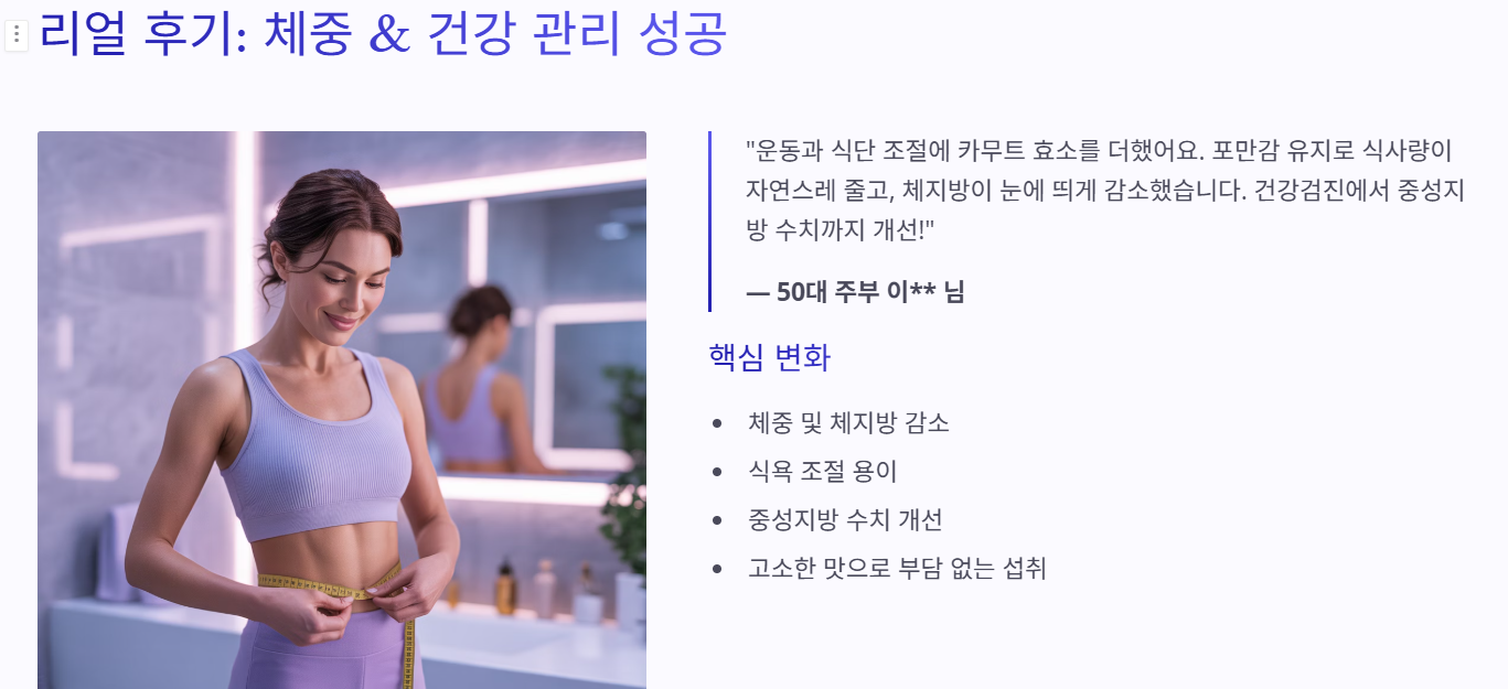 "나이가 들수록 소화력도 떨어지고, 조금만 먹어도 살이 찌는 느낌이 강했습니다. 다이어트를 위해 운동과 식단 조절을 병행하면서 카무트 효소를 챙겨 먹었어요. 효소의 포만감 유지 기능 덕분에 식사량이 자연스레 조절되었고, 장내 독소 배출과 지방 흡수 억제 기능 덕분인지 체지방이 눈에 띄게 줄었습니다. 특히 건강검진에서 중성지방 수치까지 개선된 것을 보고 꾸준히 먹어야겠다고 다짐했어요. 맛이 고소해서 부담 없이 섭취할 수 있다는 점도 큰 장점입니다." (50대 주부 이**님)
