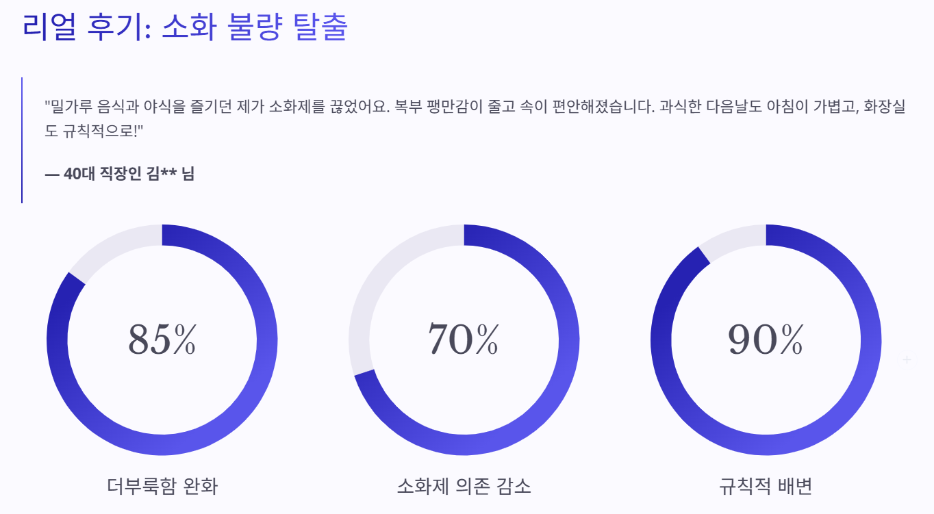 핵심 변화:더부룩함 완화, 소화제 의존도 감소, 규칙적인 배변 활동.
