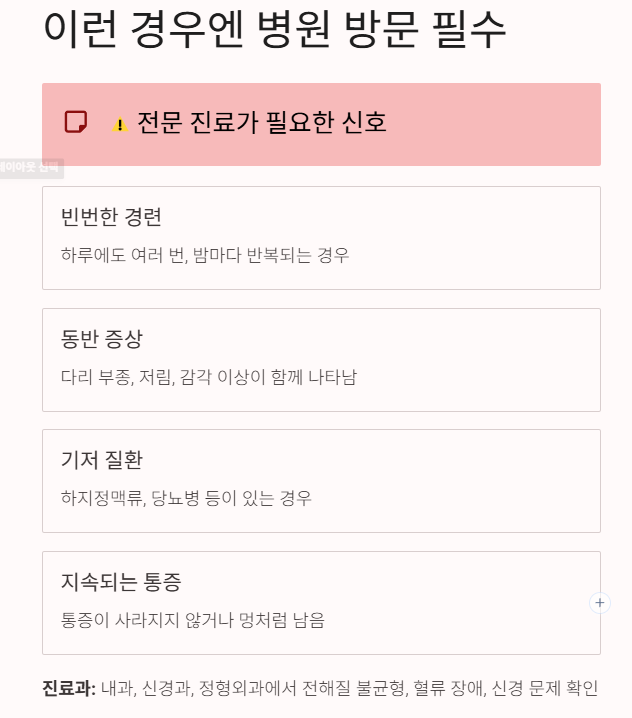 - 하루에도 여러 번 쥐가 나거나, 밤마다 반복되는 경우