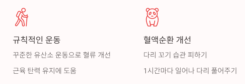 - 장시간 앉아 있을 때는 1시간마다 일어나 다리를 가볍게 풀어주는 것이 좋습니다.