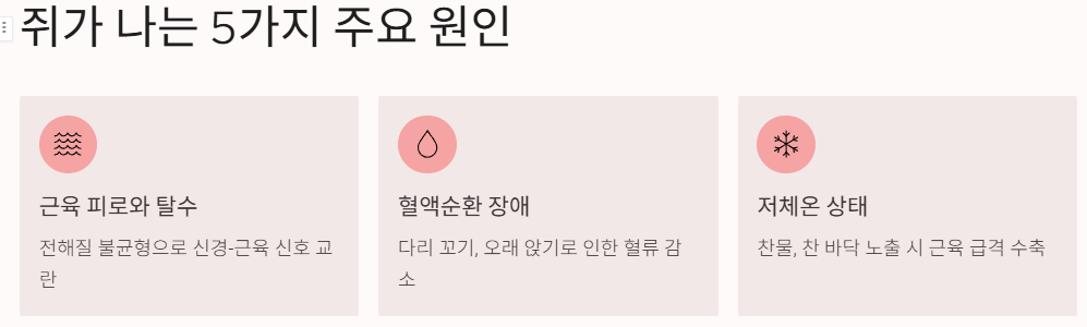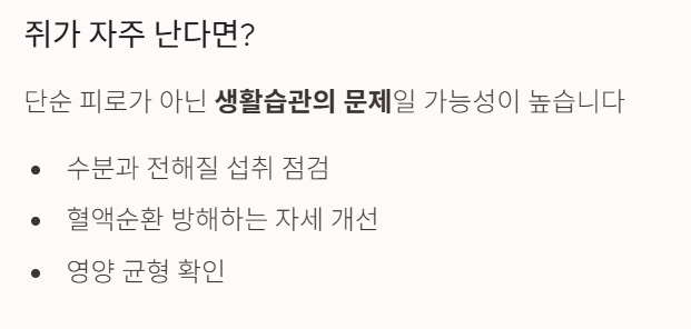 쥐가 잦다면 단순 피로뿐 아니라 생활습관의 문제일 가능성이 높습니다.