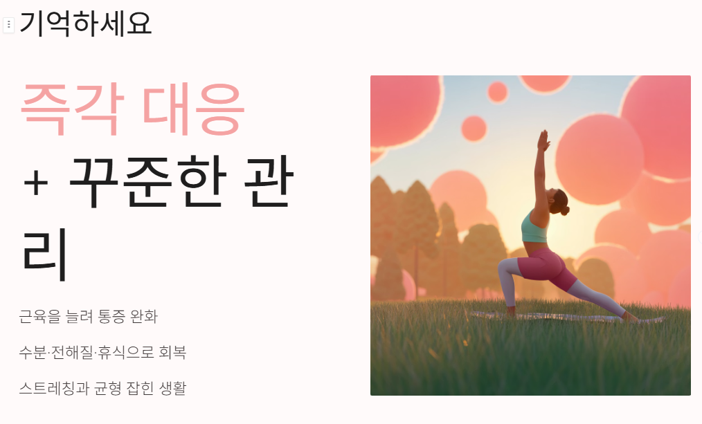 가장 중요한 것은 즉시 근육을 늘려 통증을 완화하고, 이후 충분한 수분·전해질·휴식을 통해 근육이 회복되도록 돕는 것입니다.