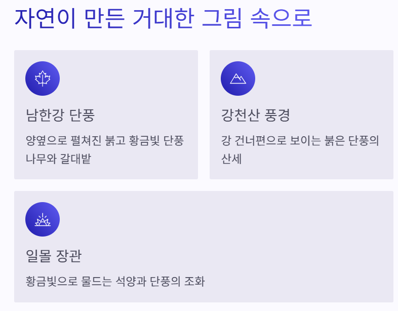 또한, 섬 안쪽에는 계절마다 다른 꽃밭이 조성되어 있습니다. 봄에는 유채꽃, 여름에는 코스모스, 그리고 가을에는 국화가 만발하여 계절마다 다른 풍경을 선물합니다. 출렁다리와 강천섬을 함께 즐기면 단풍뿐 아니라 자연 속 여유로움까지 만끽할 수 있습니다.