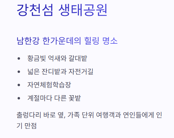 강천섬은 넓은 잔디밭과 자전거길, 캠핑존이 조성되어 있으며, 삼림욕을 즐기기에도 좋습니다. 특히 아이들과 함께라면 자연체험학습장에서 여주의 자연 생태를 직접 관찰할 수 있어 교육적인 시간도 보낼 수 있습니다.