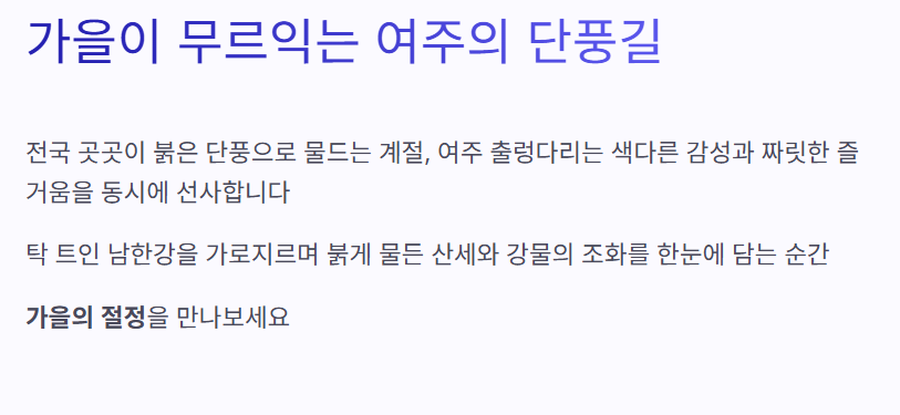 여주 단풍의 절정은 잠깐이지만, 그 감동은 오래 남습니다. 붉은 나뭇잎이 바람에 흩날리는 그 길 위에서 잠시 멈춰 서서, 바쁘게 흘러가는 일상 대신 계절의 향기와 여유를 한껏 느껴보시길 바랍니다.