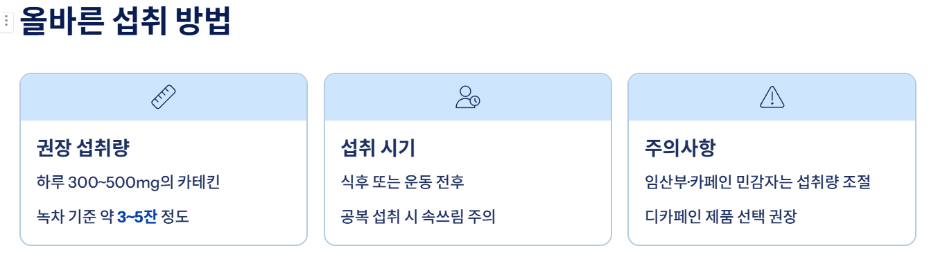 - 권장 섭취량: 하루 300~500mg의 카테킨 (녹차 기준 약 3~5잔 정도)