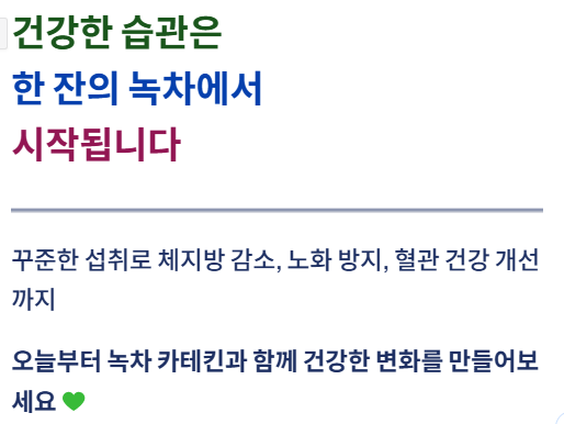 그래서 요즘은 단순히 차로 마시는 것뿐 아니라, 카테킨 함유 화장품이나 영양제 형태로도 꾸준히 섭취하는 분들이 많습니다.