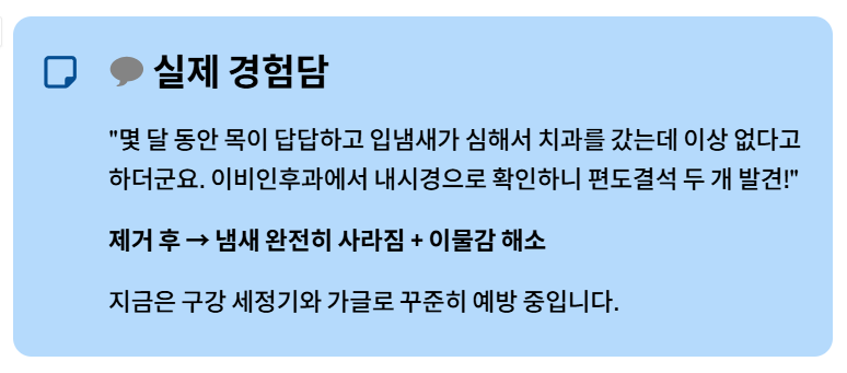 의사 선생님이 간단히 제거해주신 후에는 그동안 원인을 몰랐던 냄새가 사라졌고, 목의 이물감도 완전히 없어졌습니다.