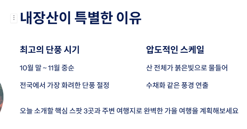후기: “내장산 단풍은 ‘화려하다’는 말로도 부족했습니다. 길 전체가 붉게 타오르는 듯하고, 단풍잎이 바람에 흩날릴 때마다 가을의 절정을 온몸으로 느낄 수 있었어요.”