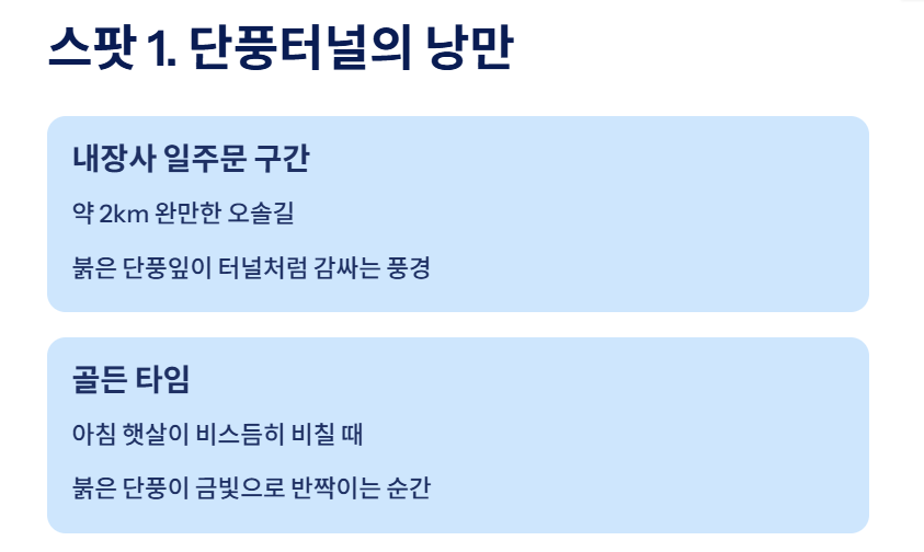 가장 대표적인 단풍 명소는 단연 내장사 입구부터 일주문을 지나 내장사까지 이어지는 단풍터널입니다. 이 구간은 약 2km 남짓한 완만한 오솔길로, 붉게 물든 단풍잎이 양옆에서 터널처럼 감싸주는 모습이 인상적이에요.