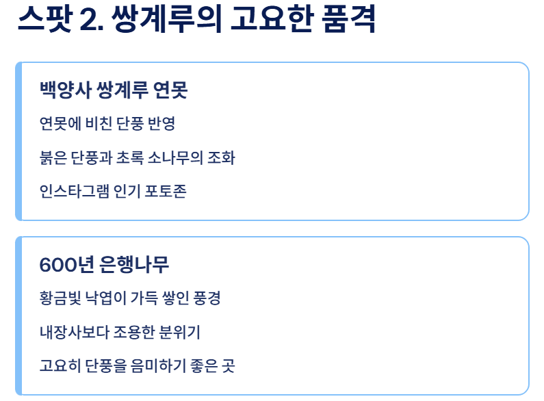 내장산 국립공원 안에는 백양사도 단풍 명소로 유명합니다. 특히 쌍계루 연못에 비친 단풍 반영(반영사진)이 인스타그램 인기 포토존이에요. 연못 위로 쌍계루가 비치고, 붉은 단풍과 초록 소나무가 조화를 이루며 환상적인 풍경을 자아냅니다.