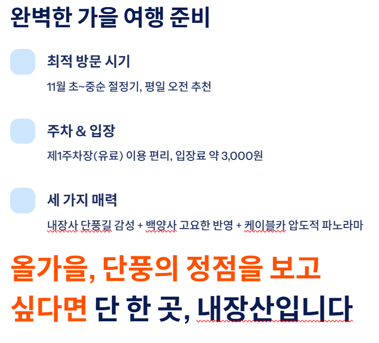 내장산 단풍은 한 번 보면 평생 기억에 남는 아름다움입니다. 내장사 단풍길에서 걷는 감성, 백양사 쌍계루의 고요한 반영, 케이블카에서 내려다보는 붉은 파노라마까지 — 세 가지 풍경이 서로 다른 매력으로 완벽한 가을 여행 코스를 만들어줍니다.